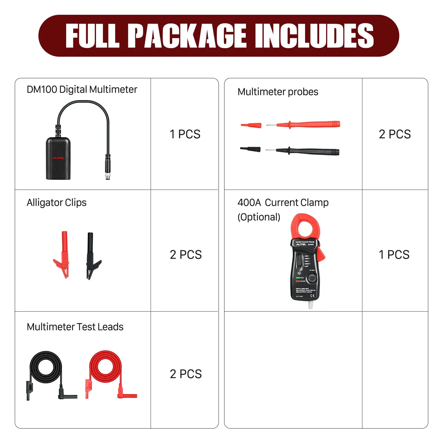 - Complete Test Kit - DM100 Digital Multimeter, 400A Current Clamp, test leads, probes, and alligator clips; 100% original Autel quality.